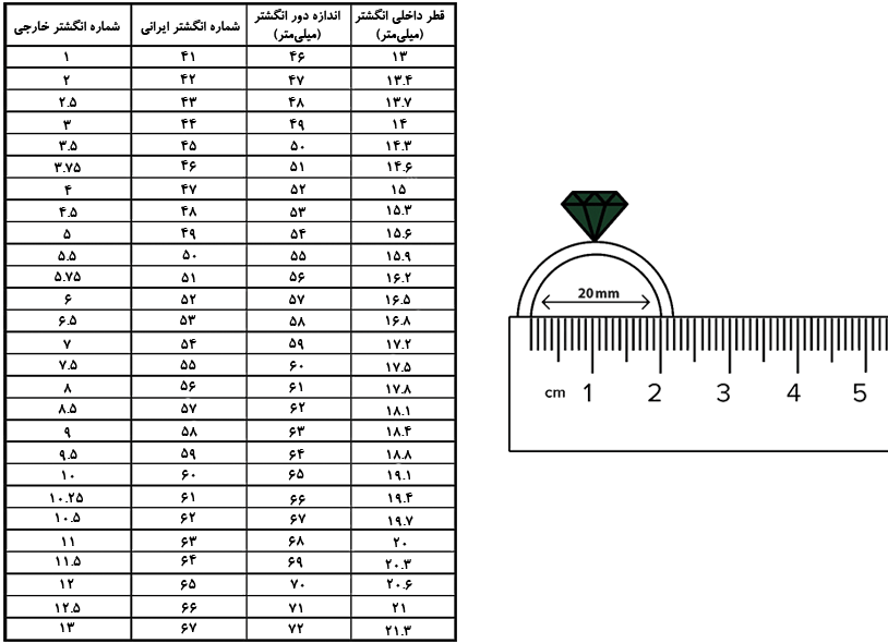 عدد بهدستآمده را با جدول تبدیل سایز انگشتر مطابقت دهید تا سایز دقیق خود را به دست آورید.